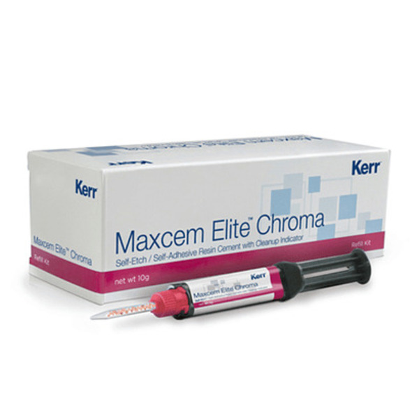 El primer cemento de resina autoadhesivo y autograbable que ofrece un indicador cromático del momento óptimo para limpiar, Maxcem Elite Chroma es uno de los cementos más inteligentes del mercado actual.