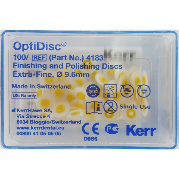 OptiDisc™ Sistema de 4 granos para contorneado, acabado, pulido y pulido de alto brillo. Para composites, ionómeros de vidrio, amalgamas, metales preciosos y semipreciosos. OptiDisc está disponible en tres diámetros diferentes, para ayudar a llegar a las áreas posteriores con facilidad sin dañar el tejido blando. El disco de alto rendimiento, ¡ahora incluso más fácil de elegir! El sistema codificado por colores permite identificar fácilmente el nivel de grano apropiado según las necesidades del procedimiento.